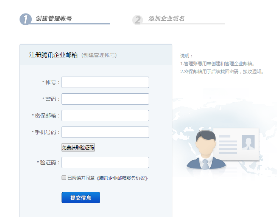 一、注册腾讯免费企业邮箱注册地址:免费注册腾讯免费企业邮箱1、创建管理账号: