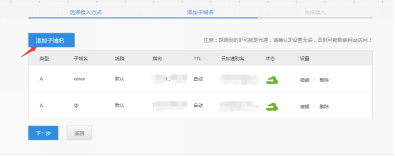 与NS接入一样,百度会自动探测子域名,如果探测不全,可以点击“添加子域名”,填写字段:子域名、选择线路(必须有一条默认线路)、服务器IP。